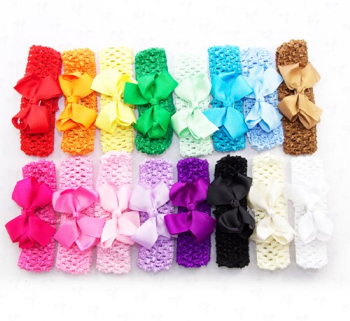 Set of 16 cute Ema Jane Boutique Quality Grosgrain hair bows and 16 matching soft Ema Jane crochet headbands perfect for any color outfit. Mix and match colors, or use the bows with one of our Ema Jane Gerber daisy headbands.