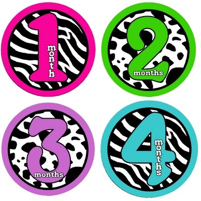 These monthly stickers are a perfect way to catch a special moment in your baby's life without having to buy a new graphic bodysuit each time. Just peel the sticker and place on a shirt of your choice each month. Whip out the camera and snap away! Great gift for parents to capture monthly birthday photos! Remove after photo taking and before washing. Reuse sticker in memory books! This design features bold animal prints with bright girl colors.