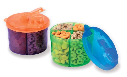 The Munchkin Snack Dispenser is one cool way to organize your snacks. It is compartmentalized into four separate sections, each of which can be used to store a different kind of food. The spout is ideal for pouring out snacks. The snack dispenser is also portable. What makes it even more travel-friendly is its snap-tight lid, which helps preserve the freshness of the snacks and stop spillage. The lid can also be removed for cleaning and filling.