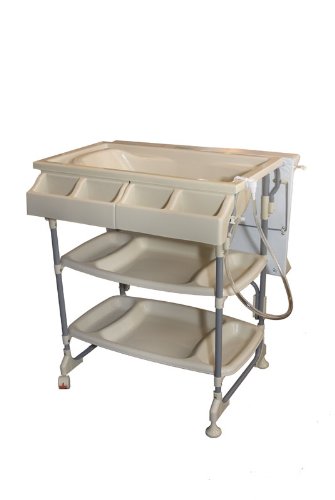 Baby Diego's sleek bathinette makes parents life so much simpler, it offers the comfort and practicality of a wheeled bathing and changing station with a sharp design. Bath baby at waist level, no more bending. The changing pad includes a safety strap and is made of soft non-toxic cushioned vinyl, great for baby diaper emergencies as the pad can be easily wiped clean. Keeps baby supplies neatly organized and provides extra storage in the two hard plastic trays below the bath.Length 32Width 18Assembly Required LightWeight Capacity 30Height 39Color BeigeSuggested age 0-18 monthsSuggested weight 30 lbs.